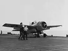 An FM-2 Wildcat fighter situated on the aircraft catapult preparing to take off, 27 July 1944.