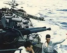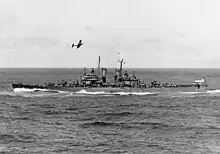 During the ensuing Formosa Air Battle on 13 October, Mobile's sister ship Houston and the heavy cruiser Canberra were both torpedoed and badly damaged by Japanese aircraft. Mobile and several other vessels were detached from TF 38 to cover the withdrawal of what was nicknamed "Cripple Division 1". The American forces hoped that further Japanese forces would be lured out to be destroyed, but the Americans were detected by Japanese scout aircraft and the bait was not taken. Once the damaged vessels had withdrawn far enough to be out of range of Japanese aircraft, Mobile left the formation and returned to TG 38.3, arriving with her unit on 17 October.[3][4]