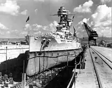 After she was thoroughly examined, Iowa and two other vessels used Nevada as a practice gunnery target 65 miles southwest of Pearl Harbor on July 31, 1948.[4][71][lower-alpha 11] The ships did not sink Nevada, so she was given a coup de grâce with an aerial torpedo hit amidships.[89][4]