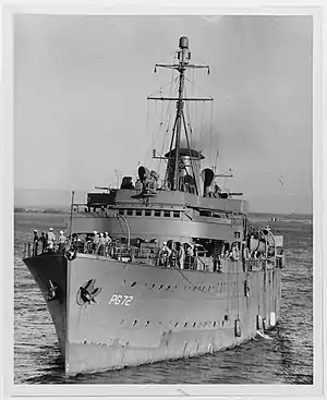 With the outbreak of the Second World War, Nourmahal was acquired by the Coast Guard on 21 March 1940 and was commissioned USCGC Nourmahal (WPG-72) on 21 August 1940. Nourmahal was acquired 3 March 1942 by the Navy from Astor under a bareboat charter agreement under which the vessel was to be operated by the Coast Guard under Navy ownership.[4] Nourmahal was designated (PG-72) 9 April 1943 and purchased by the Navy for $1,000,000 under an option of the charter on 25 June 1943 (29 June in DANFS).[5] She was returned to the Coast Guard on 29 December 1943 and reclassified as WPG-122 and was struck from the Naval Register on 12 January 1944.[4]