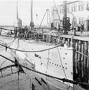 O-11 was laid down on 6 March 1916 by Lake Torpedo Boat in Bridgeport, Connecticut. The boat was launched on 29 October 1917 sponsored by Mrs. Bernard M. Baruch, and commissioned at New York City on 19 October 1918. Commissioned too late for World War I combat service, O-11 joined other boats of her class at Cape May, New Jersey, in 1919. On 20 September 1919, she was placed in commission, in reserve, at Cape May and steamed to Philadelphia, Pennsylvania, in October; workmen at Philadelphia spent months working on the boat before she departed for Coco Solo.