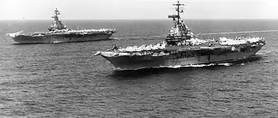 Oriskany (foreground) and her sister Bonhomme Richard conducting operations in the Gulf of Tonkin in 1970