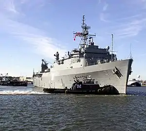 ![]() The amphibious landing dock ship USS Portland (LSD 37) stands out of the harbor at the Naval Amphibious Base Little Creek, Virginia in 2003 | |