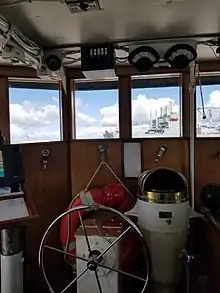 There were approximately $60,000 in upgrades made while converting the ship into a presidential yacht, to make the vessel wheelchair-accessible and more accommodating.[8] These upgrades included the conversion of the aft smokestack to a false one, a new salon, installation of brass fixtures, the presidential stateroom and bath, three guest cabins and teak decks. Additions to the fantail included a vast leather settee, patio furniture and bulletproof glass.[8] In the false smokestack, there was an elevator with a pulley system designed so that President Roosevelt could transport himself to the boat deck.[8] The fantail couch is designed so that each sitting party has their legs completely stretched out when sitting back and the president could sit equally as his guests with his legs supported.[9] An antiaircraft machine gun was installed and mounted when the president was on board.[5] Ship ballast was added to the vessel to account for these upgrades.[5] However, the ship still rolled as far as 48 degrees in rough waters, causing many a guest to turn to the rail. The president, being the sailor he was, was affected little.
