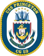 USS Princeton (CG-59) is a Ticonderoga-class guided missile cruiser serving in the United States Navy. Armed with naval guns and anti-air, anti-surface, and anti-submarine missiles, plus other weapons, she is equipped for surface-to-air, surface-to-surface, and anti-submarine warfare. She was previously home to two SH-60B LAMPS Mk III Seahawk helicopters and now carries a pair of the MH-60R version of the Seahawk. This warship is named for the Revolutionary War victories over the British by George Washington in and around the town of Princeton, New Jersey.
