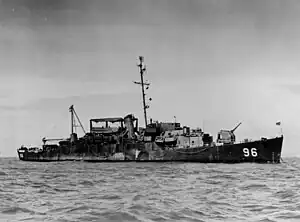 Ray K. Edwards departed Pearl Harbor on 14 September 1945 bound for Eniwetok and Okinawa, whence she steamed to Japan. She passed through the Bungo Strait and anchored in Fukuru Wan on 8 October 1945 to replenish minesweepers, tank landing ships (LSTs) and infantry landing craft (LCIs) assigned to that area. She remained in Japan through the end of 1945.[1]
