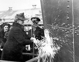 Mrs. Catherine Sheehan christens USS Sheehan at Sheehan's launching on 17 December 1943 at Boston Navy Yard, Boston, Massachusetts.