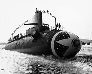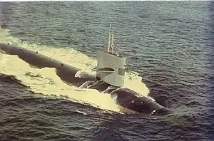 ![]() USS Silversides (SSN-679), possibly during her sea trials off New England in 1972. | |
