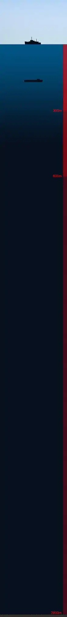 Mizar sailed on 25 June to begin the deep search and found the wreck within two days. The shattered remains of Thresher's hull were on the sea floor, about 8,400 feet (2,600 m) below the surface, in five major sections.[20] Most of the debris had spread over an area of about 1,440,000 square feet (134,000 m2). Major sections of Thresher, including the sail, sonar dome, bow section, engineering spaces section, operations spaces section, and the stern planes were found. By July 22, most of the lost submarine had been photographed.[21] In early August, the entire task force returned to the area with the submersible. Its first two dives were unsuccessful, but on the third dive, the UTE enabled placement of Trieste II on the wreck, at first not seeing wreckage because the bathyscaphe was sitting upon it.[21]