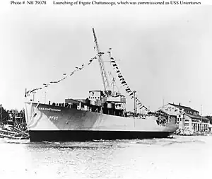 The ship was laid down under a Maritime Commission contract (MC hull 1489) as Chattanooga on 21 April 1943, at Sturgeon Bay, Wisconsin, by the Leathem D. Smith Shipbuilding Company. Launched on 7 August 1943, sponsored by Mrs. Cecilia Daniel, and brought to New Orleans, for completion on 4 April 1944. She was renamed Uniontown on 16 August 1944, to free the name Chattanooga for the Fargo-class light cruiser CL-118, and commissioned on 6 October 1944.