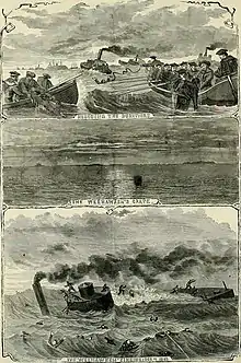 The next two months were uneventful, and Weehawken lay anchored off Morris Island during a moderate gale early on the morning of 6 December. Suddenly, the ironclad signalled for assistance and appeared to observers ashore to be sinking. Attempts to beach the vessel failed, and she sank bow first five minutes later in 30 ft (9.1 m) of water. A court of inquiry found that Weehawken had recently taken on a considerable amount of heavy ammunition in her forward compartments. This change excessively reduced her forward freeboard, causing water to rush down an open hawsepipe and hatch during the storm. As the bow sank, and the stern rose, water could not flow aft to the pumps and the vessel foundered.