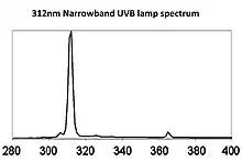 There are also narrowband UVB lamps, that emit 311-312 nanometer. Output spectrum of Philips PS-S 9W/12 narrow-band UV-B fluorescent lamp. The dose that the skin needs with these lamps, to cure from skin diseases is 2 joules per square centimeter.