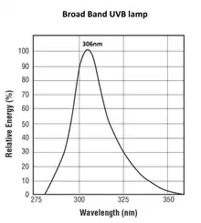 There are also fluorescent UVB lamps, called broadband UVB, or wideband UVB that have a peak wavelength of 306 nanometer. The dose that the skin needs with these lamps, to cure from skin diseases is 0.5 joules per square centimeter.