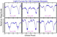 - ↑ Hakala, Pasi; Hjalmarsdotter, Linnea; Hannikainen, Diana C.; Muhli, Panu (April 2009). "Light curve morphology study of UW CrB – evidence for a 5 d superorbital period". Monthly Notices of the Royal Astronomical Society. 394 (2): 892–899. arXiv:0812.0130. Bibcode:2009MNRAS.394..892H. doi:10.1111/j.1365-2966.2008.14374.x.
