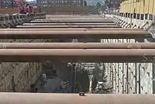 The contract for tunneling and station construction on the project, since renamed the "Northgate Link extension", was awarded by Sound Transit to JCM Northlink LLC (a joint venture of Jay Dee, Coluccio, and Michels) for $462 million in 2013.[42] In May 2013, demolition of an existing Chase Bank branch and a university-owned property began at the future site of the station.[43] In December, a segment of Brooklyn Avenue NE was closed through the work zone as part of final preparations for the station site.[44] Construction of shoring walls and drilling of pilings in the station box was completed from April to August 2014,[45][46] leading to the start of excavation the following month.[47] By the completion of excavation the following summer, over 135,000 cubic yards (103,000 m3) of dirt was removed from the site to reach a depth of 95 feet (29 m).[48] Concrete pouring of the station box began in July 2015, to prepare for the arrival of two tunnel boring machines (TBMs).[49]