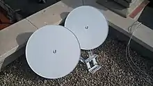A pair of Ubiquiti internet satellite dishes