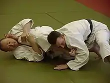 Hiza refers to knee. Gatame refers to pin. This technique is using the knee to joint lock and pin the opponent. Once the opponent is face down an arm bar can be applied using the knee on the opponents elbow, the opponents hand must be pinky up. Upwards pressure can be applied on the wrist while downward pressure is applied with the knee on the elbow. The inside of the knee area can also be used to torque the elbow/shoulder from a bottom transition.