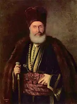 Theodorescu argues that Năsturel's contribution as a palace commissioner is enduring, being a direct precursor of experiments in the 18th-century Brâncovenesc style.[101] His literary adaptation, the blason, remained a standard and forme fixe in Romanian poetry into the 19th century, even after Slavonic had been dropped. As noted by Negrici, this pattern was exceedingly conservative, characterized by "stereotypes and repetition".[54] The Năsturel family, which continued to be associated with Udricani and Dobroteasa down to the 1840s,[102] also used Udriște's coat of arms, although this practice was tolerated, rather than endorsed, by a succession of Wallachian Princes.[103] In 1831, it transferred Herăști to Miloš Obrenović, whose Serbian princely family later sold the domain to a Romanian politician, Anastase Stolojan.[104] The Năsturels developed another property, Năsturelu in Teleorman County, which housed a model farm and lands providing for the upkeep of Sfânta Vineri Herasca.[105]