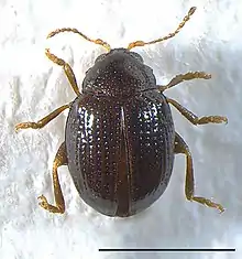 A very small beetle with a convex body. Short antennae. Smooth frons and vertex. Frontal tubercles absent. Three-segmented labial palpi. Pronotum sub-trapezoidal. Elytra indistinctly elongate and covers pygidium. Metathoracic wings are macropterous. Dorsum brownish and shiny.[1]