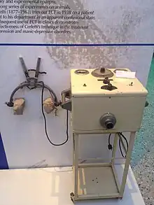 Cerletti came to the use of electroshock for therapeutic purposes in humans by way of many experiments with animals on the neuropathological consequences of repeated epileptic seizures. In Genoa, he used electric current to provoke repeatable, seizures in dogs and other animals. In these early experiments, many of the animals that were used ended up dying.[9] In Rome, his assistant Lucio Bini realized a rudimental apparatus with a control panel that could safely be applied to humans.[10]