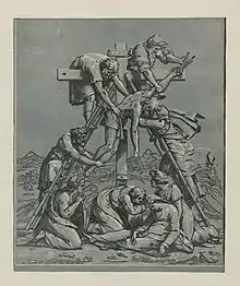 Over the years Ugo reproduced designs by numerous artists, including Raphael, Baldassare Peruzzi, and Parmigianino.[2] According to Vasari, Ugo da Carpi even taught the print-making process to Parmigianino.[10] The majority of Ugo's carvings are copies or reproductions of other works.[8] Although Ugo's works are interpretations and not exact copies, it is unlikely that Ugo invented the design for many of his woodcuts.[8] In all surviving prints and inscriptions, Ugo has signed the work as "the cutter" or "the printer," speaking to his focus on copying other works.[8] However, this was not uncommon, since replicating other artistis' work was the focus of the engraving and printing communities at this time.[8]