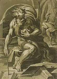 It is believed that Ugo carved Diogenes in Bologna between 1527 and 1530.[7] The initial design for this print came from Parmigianino, who Vasari incorrectly reported also created the woodcut.[11] Caraglio, who often created engravings for Parmigianino, produced an engraving based on his sketch.[12] Although the majority of scholars agree that Ugo's woodcut was based on Caraglio's engraving,[8] some experts, such as David Laundau, believe that Ugo worked directly with Parmigianino to produce his woodcut.[8] There are three reasons scholars believe this is a possibility. First, Caraglio's engraving (287 mm x 218 mm) is significantly smaller than Ugo's woodcut (490 mm x 354 mm). Most copies in Rome at this time were almost identical in size, and Ugo's woodcuts always corresponded in size to the models.[8] Therefore, Ugo may have copied this image from a sketch closer in size to his final work. Additionally, whenever Ugo's models can be identified, he never omits, adds or changes important details, as he does in Diogenes.[8] This also makes it more likely that Ugo was working more closely with Parmigianino than often believed. Finally, as Landau describes it "There is no precedent for Ugo making what can only be called a powerful image from so weak a model. This is Ugo's masterpiece and he must have had Parmigianino's hand very close to his woodblock when he produced it."[8]