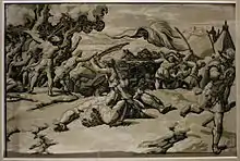He set up a workshop in his house and printed and published blocks in his own shop.[8] In 1518, he received a copyright from Pope Leo X for his four-block print The Death of the Ananias.[8] This work, along with many more of Ugo's chiaroscuro works from this time period, are considered by scholars to be the best examples of "truly reproductive prints."[8] Although Ugo was focused on reproducing and replicating sketches, engravings, and prints by other artists while in Rome, he began to develop his own unique style. An early example of this is present in Ugo's replications of Raphael's sketches, where he chose colours for his prints dissimilar to the ones used by Raphael.[8]