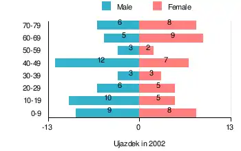(by age group in 2002)TOTAL 0-9 10-19 20-29 30-39 40-49 50-59 60-69 70-79 I. TOTAL person 101 17 15 11 6 19 5 14 14 — of which in % 100 16.8 14.9 10.9 5.9 18.8 5 13.9 13.9 1. BY SEX A. Males person 54 9 10 6 3 12 3 5 6 — of which in % 53.5 8.9 9.9 5.9 3 11.9 3 5 5.9 B. Females person 47 8 5 5 3 7 2 9 8 — of which in % 46.5 7.9 5 5 3 6.9 2 8.9 7.9