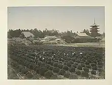 To revive the local tea markets, Shichirobei of Nagatsura village had invited elite tea farmers from Uji to improve their production yield. This was then followed by Nakayama Monotari of Heta village, Nomura Saheiji of Yamazaki village and Sakurai Denzaburo of nearby Nagaido village. The growing tea industry in Japan made tea to be one of the major export items in 1859.[13][12] In fact, tea trading in 1867 was 18 times greater than 1859, with around 7 million pounds of tea being exported in 1867. Tea agriculture in Japan was also observed to expand by 66% in 1883 in only 10 years.[13] Many lands in the Yamachiro area of Kyoto were cleared for tea growing, such as Wazuka Town and Minami Yamashiro Village.[12]