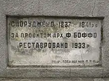 A sign on the Potemkin Stairs in Odesa: "It was built in 1837-1841. according to the project of arch. F. Boffo. Restored in 1933." (Ukrainian: Шильда на Потьомкінських сходах в Одесі: «Споруджено 1837—1841 рр. за проєктом арх. Ф. Боффо. Реставровано 1933 р.», romanized: Shylda na Potiomkinskykh skhodak v Odesi: «Sporudzheno 1837—1841 rr. za projektom arkh. F. Boffo. Restavrovano 1933 r.»)