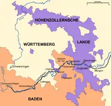 The Danube Valley Railway was never conceived as one comprehensive railway from Ulm to Donaueschingen, and certainly not all the way to Freiburg im Breisgau, but came together as individual pieces of several railway projects, which were constructed over the course of about 25 years. Especially the borders between the states of Baden, Württemberg, and the Province of Hohenzollern, which became part of Prussia in 1850, made such comprehensive railway planning difficult. In just the section between Mengen in Württemberg and Immendingen in Baden, the Danube Valley Railway crosses state borders a total of ten times. The section between Ulm and Immendingen was built by the Royal Württemberg State Railways (Königlich Württembergischen Staats-Eisenbahnen or K.W.St.E.), while the section between Immendingen and Donaueschingen was constructed by the Baden State Railways (Badische Staatseisenbahnen). Prussia did not take part in the construction of the line, even though parts of it do run across the areas belonging to the Province of Hohenzollern.