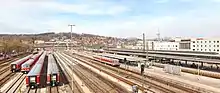 Shorter trip times, as well as the move of the single-track train crossing points between Tuttlingen and Sigmaringen, would also be the pre-requisites for the development of a Stadtbahn Tuttlingen, which has been under discussion since 2006. This model would use the Donautalbahn, which runs through the city center, as well as residential and industrial areas in the Tuttlingen area, as a city rail line (Stadtbahn), and would connect the communities east of Tuttlingen, which are poorly served by the Ringzug, to this network.[7] Probably the most ambitious plans are the ones for a S-Bahn network Ulm/Neu-Ulm. These plans, extant since the 1990s, envision the construction of a new rail line, which would branch off the existing Donautalbahn in Ehingen (Donau) and go to Erbach (Donau) on the Südbahn. This new railway would see only the RegionalExpress trains going from Ulm via Sigmaringen to Neustadt (Schwarzwald), which would significantly cut the trip times. The old section between Ehingen via Blaubeuren, which is densely populated, would be served by a new S-Bahn in the Ulm area. The new section has been tagged with a cost of 75 million Euros. The regional association Donau-Iller supports these plans, which are opposed by the government of the state of Baden-Württemberg.[8][9]