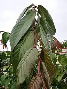 Ulmus lanceifolia can reach a maximum height of 45 m, placing it on a par with the English Elm, but with pendulous branches; the bark of the trunk exfoliates in thin scales. The leaves, borne on wing-less branchlets, are narrow, generally lanceolate, < 10 × 3.5 cm, and thick. Schneider's leaf-drawing (1907) shows some 16 vein-pairs.[1] The tree is deciduous in the north of its range, where it can occur at altitudes of up to 2500 m, but evergreen in the tropics. Given the latitudinal range, there is inevitably a substantial variation in its flowering time, beginning in October in the north, but advancing to February–March in the south. The obovate samarae are 12–30 mm long by 11–24 mm broad.[2][3] Ploidy: 2n = 28.[4]