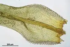 Light microscopy of a leaf of U. bruchii showing the rectangular hyaline cells along the margin of the leaf.