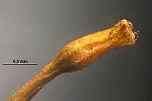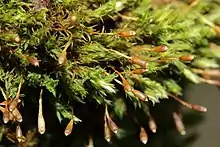 Ulota mosses tend to grow in a tuft on the substrate, with the shoots growing in an acrocarpous fashion with the shoots standing up.[10] The tufts can vary in colour, ranging from a deep green at the top of the tuft to a darker brown/red at the base of the cushion.[4] The oblong to linear-lanceolate leaves are attached to an erect stem, and can be slightly flexed to fully curled when dry.[11][5] The genus is characterized by the slightly to fully curled leaves when dry. The leaves have a costa, or midrib, which runs the entire length of the leaf.[5] The leaves have hyaline cells at the basal margins of the leaves, which are typically square or rectangular shaped.[11] The leaf base can be expanded or gradually tapered as it connects to the stem.[12] At the tip of the leaves, there are cells with very thick cell walls.[13] At maturity, the sporangia can be ribbed or unribbed.[4] The sporangia sit on top of a seta, which holds it above the gametophyte. Between species of Ulota, there is variation in the length of the seta which can be a useful trait in classifying species.[12] The sporangia have peristome teeth are diplolepidous, with 8 to 16 exostome teeth and 8 endostome teeth.[11][5] The sporangia sit on top of a seta which attaches to the gametophyte at the apex of the shoot.[3] The calyptra covers the developing sporangium and is typically conic, split at the base, and can be naked or hairy.[5] The rhizoids are placed at the base of them stem, occasionally appearing along the stem, and are smooth.[4]
