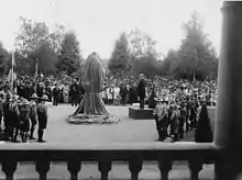 A bust of Umeå's founder, Gustav II Adolf, is located midway between Storgatan (the Main Street) and the double stairs on the town hall's south side (towards the river). The bust is made of bronze and stands on a granite plinth. The plinth has a medallion with the monogram GARS (Gustavus Adolphus Rex Sueciae). The overall height is about three meters, and the bust was created by the artist Otto Strandman. The statue was unveiled in a festive ceremony on August 20, 1924 in connection with the 300th anniversary of Västerbotten Regiment.[16]
