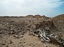 Amid the second season, 1990–91, the Japanese group unearthed two burial complexes labelled J-3 and J-4, which featured a series of oval burial mounds measuring between 4 and 8 meters in diameter. The mounds were heaped on a thin, level layer of dark-colored sand with a depth of 4 to 8 centimeters. The mounds themselves were made mainly of light-colored sand and were slightly slanted.[7] After the mounds were dug up, oval arrangements of intently piled stones with recessed centers were uncovered. Disturbance of some of the mounds by grave robbers was readily apparent. Both complexes contained burial chambers covered by roof slabs and heaps of pebbles. Within one of the chambers, a skeleton was discovered, but it had decayed beyond the point of recognition, and no further information could be discerned. Artifacts recovered from the chamber include a little circular bead made of dark transparent flint glass and fragments of a bronze or copper bowl.[8]
