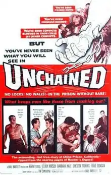 Unchained is a 1955 prison film written, produced and directed by Hall Bartlett (the first film directed by Bartlett) and starring Elroy Hirsch, Barbara Hale, Chester Morris, Todd Duncan, and Johnny Johnston. Based on the non-fiction book Prisoners are People by Kenyon J. Scudder, it is most remembered for its theme song, "Unchained Melody".