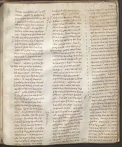It is one of the very few codices written in three columns per page. Other codices with three columns include Codex Vaticanus, Codex Vaticanus 2061 and 460.