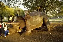 From the 1970s to 1994, the statue was located at the National Mall in front of the National Museum of Natural History.[2][7] In 1994, the statue was returned to the Zoo and was displayed in the former rhinoceros yard until 2003, when the yard was renovated for the Zoo's expanding Asian elephant family.[2][8]