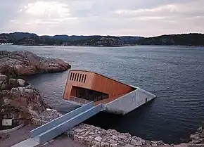 Under is an underwater restaurant in Lindesnes, Norway. Its dining room is found 5.5 metres below sea level. The eating floor is 495 square metres, making it the biggest underwater restaurant in the world, with a capacity of 40 people. It is the only underwater restaurant in Europe, and only the third to be found worldwide. Under also doubles as a sea lab, facilitating research in marine biology.[1] The restaurant was designed by Norwegian architecture-firm Snøhetta.[2]