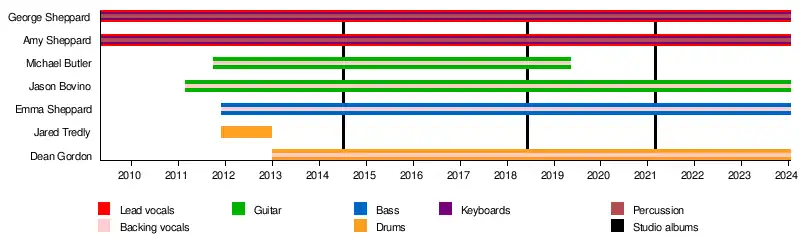 The Sheppard siblings were born and grew up in Port Moresby, Papua New Guinea to parents Greg and Linda Sheppard, where they attended the Sir Hubert Murray International (primary) School (now part of the Ela Murray International School [TEMIS for short] chain).[1] The family relocated to Brisbane, where Amy attended Somerville House for secondary education; by 2009, she was studying music at TAFE Queensland Brisbane.[1] After attending Brisbane Boys College in 2004, George shifted to Sydney; there he "toyed" with an acting career before returning to Brisbane six years later.[1] Youngest sister Emma learned to play bass guitar while enrolled at Somerville House; she officially joined the band after graduating in 2011.[1][2]