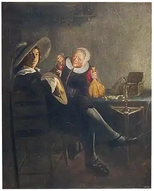 The painting shows the theme of the ill-matched couple, a popular theme in the arts of the period, though generally the one making the proposition is a man to a courtesan, not a woman to a man. The theme generally shows the man offering the woman a ring in combination with a purse of money. Earlier examples of Haarlem versions of this that were based on earlier Flemish examples are: