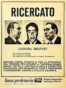 *For the kidnapping of Aldo Moro *for the assassination of Casalegno *for the aggressions against Czechoslovakia, Angola, Somalia, etc. Brezhnev leads, through KGB, the strategy of terror to impose the 'emergency government' under control of pro-Soviet forces, to spread chaos and to prepare aggression against Italy and Europe."