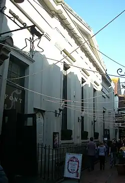 The building is a dominant presence on the north side of Union Street,[10] now a very narrow pedestrianised passage in the heart of The Lanes, the series of passageways lined with old buildings which formed the centre of the ancient village.[6] The tall, wide, stuccoed façade, facing south, is in the Greek Revival style, with Doric pilasters, a triglyph and a large pediment—in keeping with many of the Wilds–Busby partnership's Regency era buildings in Brighton; but the two doorways and three windows are tapered from bottom to top, a feature associated with Egyptian Revival architecture.[10][12][14][20] The roof is partly gabled.[1] The east wall, facing Meeting House Lane, pre-dates the 1825 work on the main façade; it consists of cobbled stonework and flints in a regular pattern, with red-brick dressings at the corners and around the arch-headed sash windows on the ground floor and the larger rectangular first-floor sash windows.[1][11]