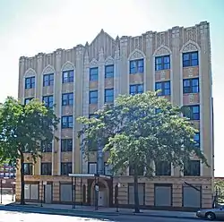 The Union Park Hotel is a historic hotel building located at 1519-1521 W. Warren Boulevard in Chicago, Illinois. The building was built in 1929-30 as an apartment hotel, a common type of housing for Chicago laborers in the 1920s. The hotel's Art Deco design reflects the national popularity of the style in the 1920s. The building's piers give it a vertical emphasis common to Art Deco works, and its decorative elements reflect the style's geometric focus. The colorful brick and terra cotta facade of the building is also characteristic of Art Deco buildings of the late 1920s, though color is seldom used extensively in Chicago's other Art Deco buildings.[2]