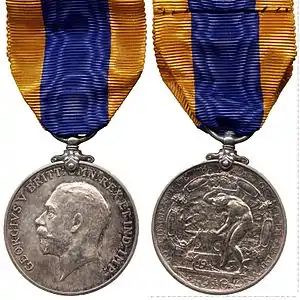 The Union of South Africa Commemoration Medal is a military and civil commemorative medal which was awarded to commemorate the opening of the first Union Parliament by the Duke of Connaught and Strathearn in 1910. It may be considered as the first of many independence medals which were instituted throughout the Commonwealth during the 20th century.[1][2][3]