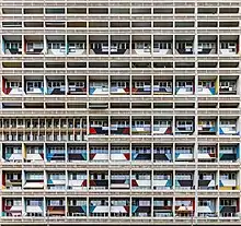 Unité d'Habitation of Berlin (The name given by Le Corbusier is Unité d'habitation "Typ Berlin") is a 1958 apartment building located in Berlin-Westend (borough of Charlottenburg-Wilmersdorf), Germany, designed by Le Corbusier following his concept of Unité d'Habitation.[1] Le Corbusier's Unité d'Habitation concept was materialised in four other buildings in France with a similar design. The building is constructed in béton brut (rough-cast concrete) and is part of the initial architecture style we know today as brutalism. The structure was built with on site prefab cast concrete panels and poured ceiling slabs. The Modulor system is the base measure of the Unité and Corbusier used not more than 15 Modulor measures to construct the entire structure form. Ultimately the work has been eliminated from Le Corbusier's oeuvre,[2] which he confirmed[3][4] himself until his death in 1965 and which has also been confirmed posthumous in 1967 in his last authorized publication of his work.[5]