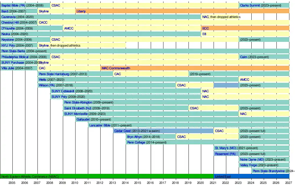 - 2023 – The United East and the CSAC officially announced that the merged conference would retain the United East name, officially ending the CSAC on July 1. Consequently, all ten members from the CSAC (Bryn Athyn College, Cairn University, Cedar Crest College, Clarks Summit University, Keystone College, Notre Dame of Maryland University, Rosemont College, Saint Elizabeth University, the University of Valley Forge and Wilson College of Pennsylvania) joined the United East as full members, beginning the 2023–24 academic year. Clarks Summit (formerly Baptist Bible), Keystone, Cairn (formerly Philadelphia Biblical), Wilson (Pa.), Saint Elizabeth (N.J.) and Bryn Athyn were all former full members at one point during their tenure within the United East (formerly known as the NEAC) before the rebrand in 2021.