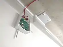 Wireless fire alarm transmitter being retroactively installed in a high-rise block to enable evacuation without a waking watch.